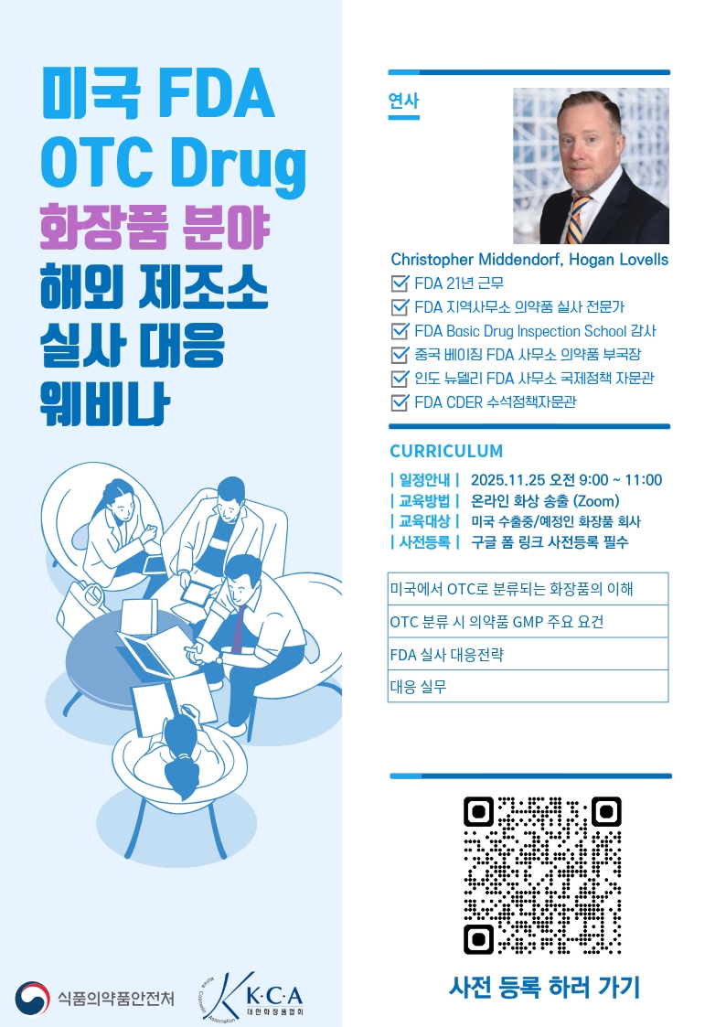 이번 교육에서는 FDA 근무 경력을 보유한 전문가가 강사로 참여해 ▲ 미국에서 일반의약품으로 분류되는 화장품의 기준 ▲ OTC Drug 제조 및 품질관리(GMP) 요구사항 ▲ FDA 실사 프로세스 및 대응 전략 등 현장 중심의 실무 지식을 전달한다.